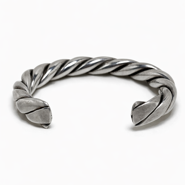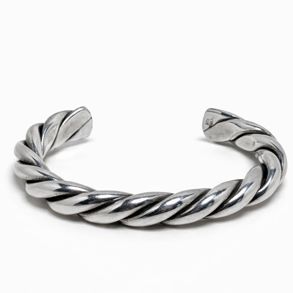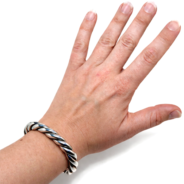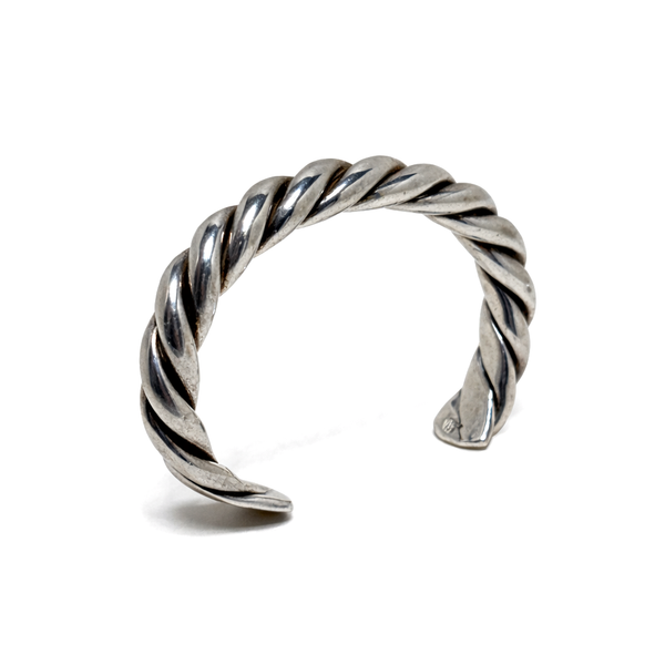 Solid sterling silver cuff made in Taxco, Mexico, dating to the 1980s. The bracelet features a twisted rope form with a high-polish finish and is in excellent used vintage condition.