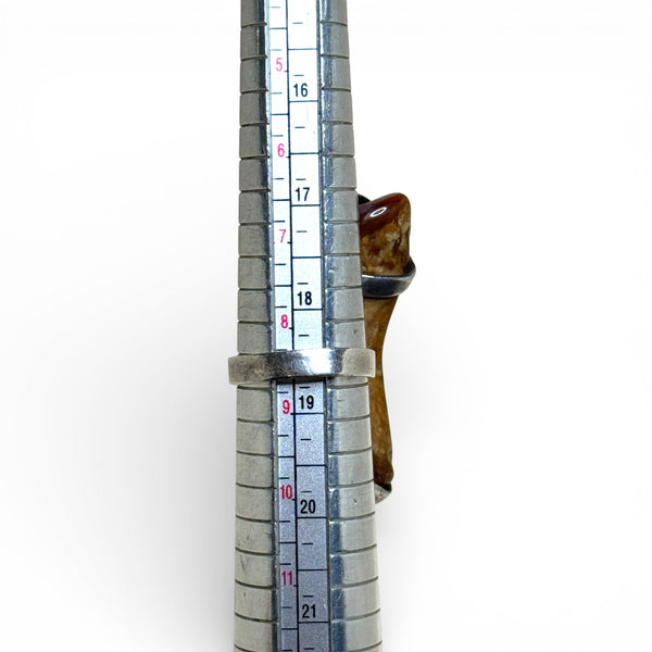 Sterling silver ring featuring a freeform fire agate slice with natural banding and raw edge details. The stone is secured with simple prong elements atop a single, simple silver band, allowing the organic shape to remain the focus. Likely made in the 1980s–1990s; in excellent used vintage condition.
